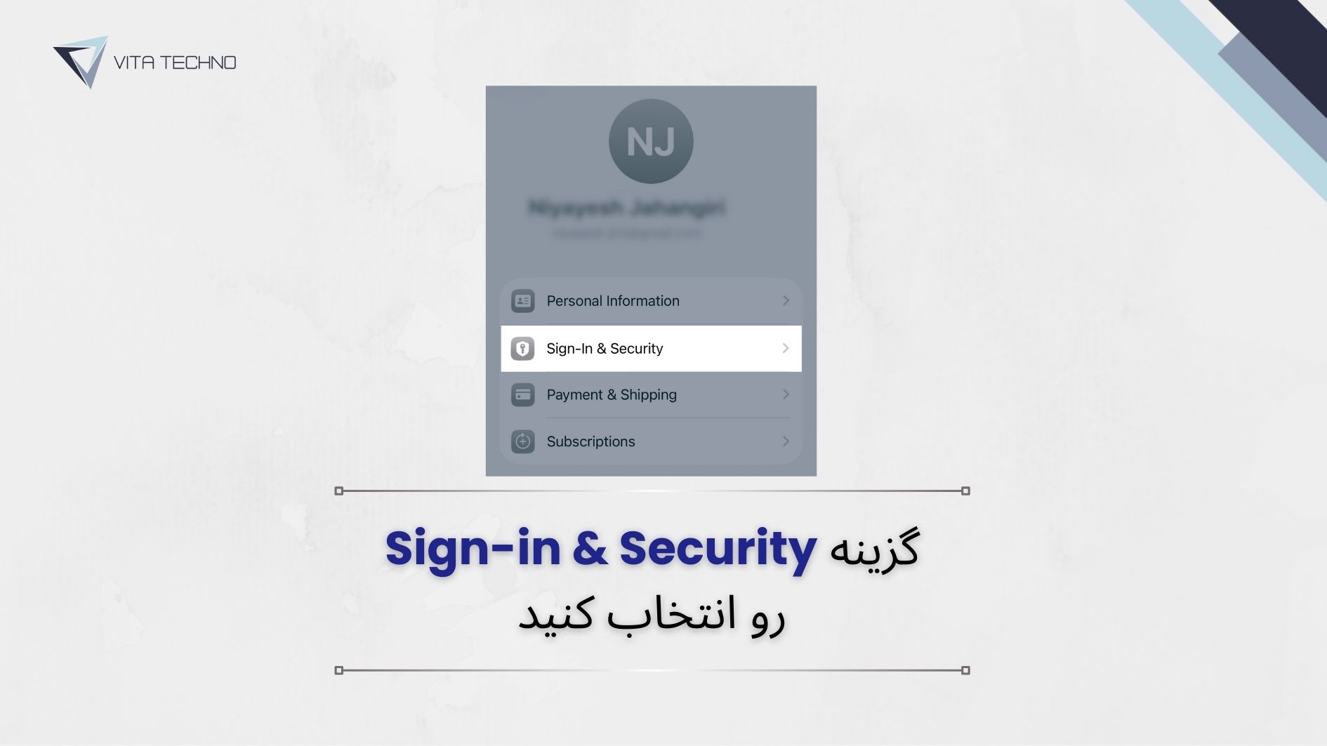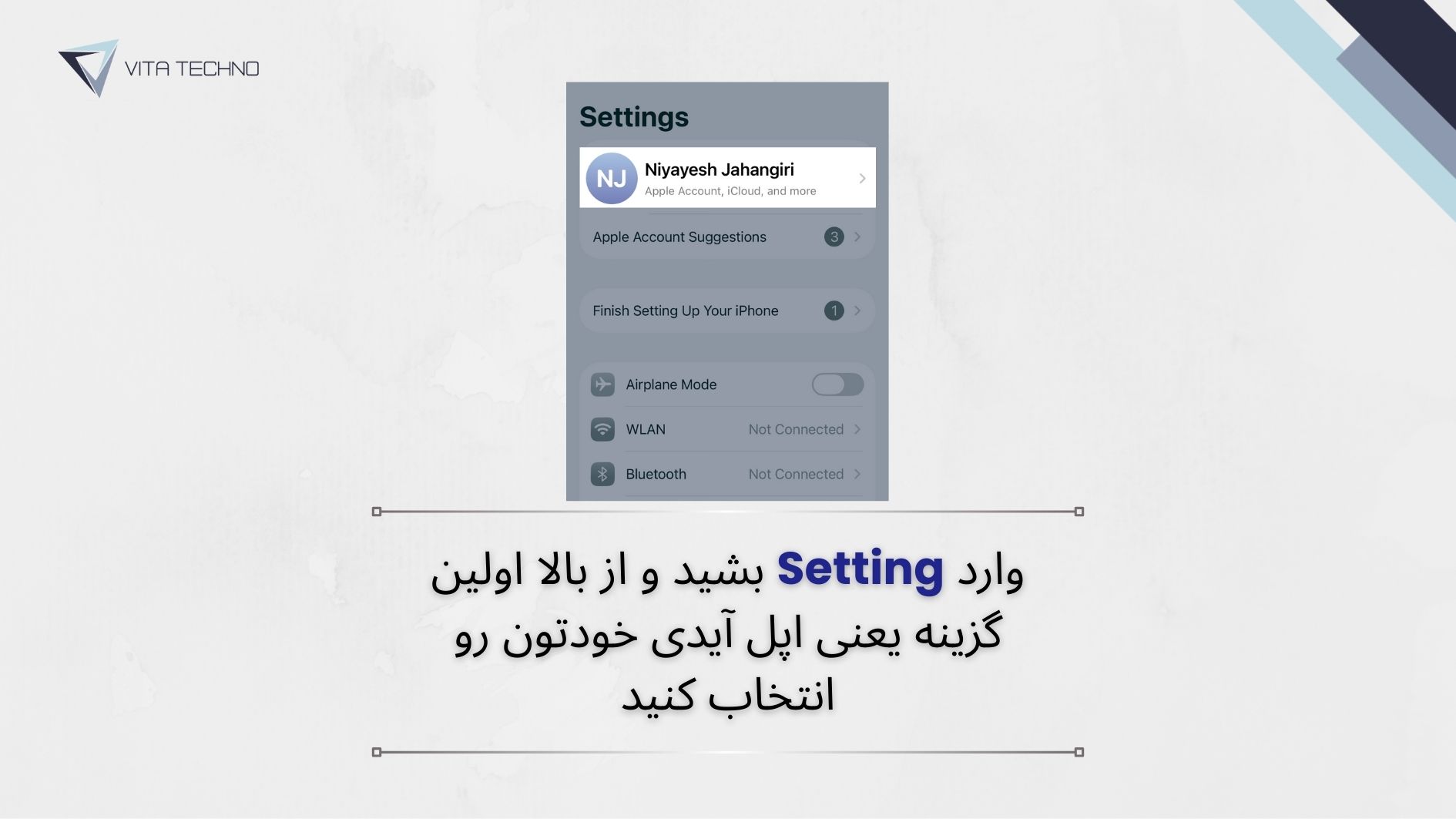 - وارد Setting بشید و از بالا اولین گزینه یعنی اپل آیدی خودتون رو انتخاب کنید