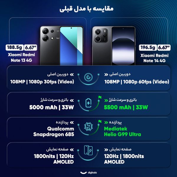 شیائومی Redmi Note 14 4G یکی از جدیدترین گوشی‌های سری نوت شیائومی است که همواره از پرفروش‌ترین سری‌های شیائومی بوده‌اند. این موبایل که در ژانویه 2025 معرفی شد، با ابعاد 163.3x76.6x8.2 میلی‌متر و وزن 196.5 گرم طراحی‌ای زیبا و ارگونومیکی دارد. از طرفی با مقاومت در برابر پاشش آب و گرد و غبار و داشتن استاندارد IP54 در شرایط مختلف دوام و پایداری بیشتری ارائه می‌دهد. صفحه ‌نمایش 6.67 اینچی AMOLED با نرخ بروزرسانی 120 هرتز و روشنایی 1800 نیت، نمایش تصاویری زنده و شفاف را تضمین می‌کند. فناوری Always-on Display تجربه‌ای منحصربه‌فرد در مشاهده محتوا فراهم می‌کند. محافظ Corning Gorilla Glass 5 نیز صفحه نمایش را در برابر خط و خش محافظت می‌کند. پردازنده بهینه Mediatek Helio G99 Ultra با معماری 6 نانومتری، در کنار پردازنده گرافیکی Mali-G57 MC2، عملکردی روان و بی‌نقص در اجرای اپلیکیشن‌ها و بازی‌های نیمه سنگین ارائه می‌دهد. باتری 5500 میلی‌آمپرساعتی با قابلیت شارژ سریع 33 وات نیز استفاده طولانی ‌مدت و شارژ سریع را تضمین می‌کند. دوربین اصلی 108 مگاپیکسلی با لنز عریض و فناوری فوکوس PDAF، تصاویری شفاف و حرفه‌ای ثبت می‌کند. دوربین ماکرو 2 مگاپیکسلی تجربه‌ای جذاب برای عکاسی از جزئیات فراهم می‌کند. دوربین سلفی 20 مگاپیکسلی برای عکس‌های شخصی و تماس‌های تصویری بسیار مناسب است. در پایان، ردمی نوت 14 4G با سیستم‌عامل Android 14، بلوتوث 5.3، و حسگر اثرانگشت زیر صفحه نمایش، Redmi Note 14 4G مجموعه‌ای از طراحی زیبا، عملکرد قدرتمند و امکانات متنوع را ارائه می‌دهد که نیازهای کاربران را به‌خوبی برآورده خواهد کرد.